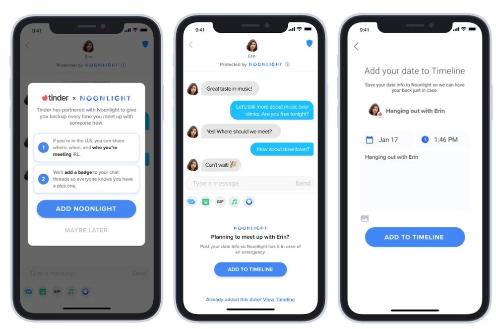 However, the use of personal safety apps does not happen without a trace. They can help create what Koskela (2004) calls ‘doubled digital individuals' out of its users. Personal safety apps generally position themselves as a tool for protection, but the state of privacy within such apps can be questionable. An analysis by Parachute found that 20 popular iOS safety apps send users’ information to data collection companies mostly without users’ knowledge and ability to control this (Parachute Engineering, 2020). The previously mentioned app Noonlight is a prominent example of this. Noonlight has several partners, including Facebook and YouTube, collecting some sort of information from their app. Apart from this, Noonlight also collaborates with the dating app Tinder by providing a safety feature that is meant to make Tinder users feel ‘protected’ while going out to meet someone new (as shown in Figure 6) (Tinder, n.d.). According to Warzel (2018), Tinder itself is also known for sharing user data with Facebook (Warzel, 2018). The data shared from personal safety apps are not only about device specifications and download statuses but can also concern very sensitive data in the case of actual assault (Wodinsky, 2020). Another unavoidable question of access and thus power arises: who has access to the data which is collected through the very apps that are supposed to be a tool for protection?