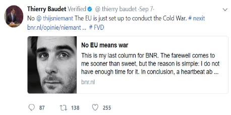 Thierry Baudet’s voice and representation of FVD clearly appeals to many, as can be seen on his social media platforms. With 74.3k followers on Twitter and 16.6k followers on Instagram, Baudet’s voice is heard throughout the Netherlands. Twitter, the main medium used for Baudet’s communication, shares not only personal information but often also posts of him retweeting from the political party’s account as means of promotion. Baudet’s larger platform on Twitter could be an indicator that his content is taken more seriously (possibly because politicians are more likely to use Twitter) as opposed to his Instagram. The main difference between the two social media platforms is that Baudet’s personal life is more private on Twitter; often only discussing general politics, updates about Forum Voor Democratie, information regarding the Netherlands and the European Union (EU).