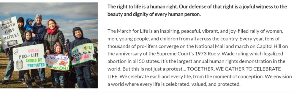 Relatedly, Donald Trump delivered a speech at the 2020's edition of March For Life at the rally, which was live-streamed. He is the first president to ever personally attend this protest in Washington against Roe v. Wade. In his speech, he spoke to the pro-lifers and thanked them for the big turnout of thousands of people. He mentioned his Christian values to express his shared aversion to abortion: “It’s your generation that is making America the pro-family and pro-life nation” (Minute 3.54-4.01). “All of us here understand an eternal truth that every child is a precious and sacred gift from God” (Minute 5.37-5.45). This supports the claim that Christianity is embedded in pro-life’s ideology.