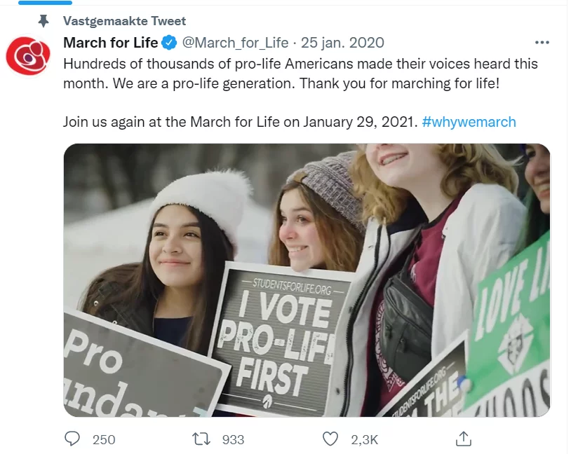 Not every radical pro-lifer will directly harass people seeking an abortion. On a more national and even transnational level, the pro-life movement, or as the major organisations call it the Right To Life movement, is active both online and offline to mobilise pro-life. The pro-choice movement has the nationwide Women’s March as their biggest nationwide pro-choice event. Pro-life cannot compete with that, but with the March For Life, pro-life also achieves a big turnout forming a strong front of voices advocating against abortion.