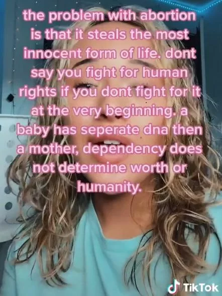 - She directly addresses pro-choicers in her video: "Don't say you fight for human rights if you don’t fight for it at the very beginning”. Doing this, she attempts to criticise pro-choice for not caring about life from conception onwards.
