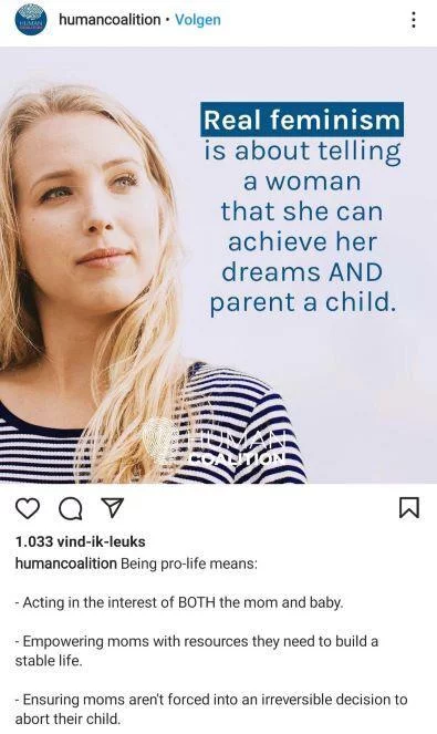 Human Coalition is such an organisation with 29,3 thousand followers on Instagram. These pro-lifers see themselves as change agents and want to rescue both the woman and the baby. Human Coalition's website states: “It’s not simply because we are against abortion but because we are for life. We are for preborn babies who need to be protected in the womb; for women who should not have to choose the life of their baby for a fulfilling life”.