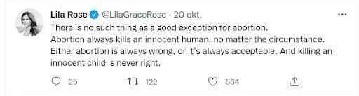 Radical pro-lifers, part of the extreme side, believe that abortion is always murder with no exceptions allowed. The tweet below is emblematic of Pro-Life's radical view (Figure 4). Lila Rose is an American anti-abortion activist who considers an embryo already a child that gets killed by abortion and believes that this can never be justified.