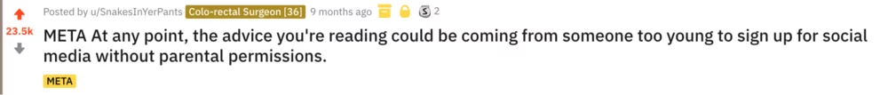 In the months to follow, many other seasoned group members complained about unsophisticated and immature thread responses posted by novices. The user u/SnakesInYerPants pointed out that many underage users might have joined the group recently after "teen-star" YouTubers promoted the subreddit. u/SnakesInYerPants, along with many other users, seem to doubt that a minor's life experience and mental capacity may be sufficient to provide proper advice in serious matters. In fact, teenagers are struggling to manage many social norms online adequately, and social media frequently combines several social contexts. Besides, since their interactions in social networks are connected to their broader peer groups, teens often draw norms from their school life to the online world (boyd, 2014, pp. 29-36).