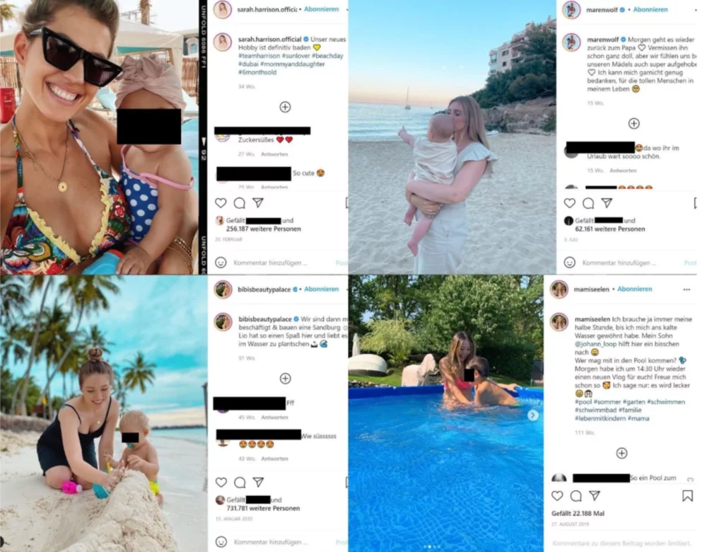 Even though parents in Germany can decide what happens to the pictures of their children up to the age of 14 (Kanzlei WBS, 2021a) personal rights can also be violated under the age of 14, for example, if children are seen in embarrassing situations (Kanzlei WBS, 2021b). This also includes crying or sick children (MrWissen2go, 2021). In addition, there are photos that by definition invade children's privacy (Kanzlei WBS, 2021a). These include, for example, naked pictures, photos in the bathtub or on the beach. Figure 4 shows some pictures of the above-mentioned influencers that violate the child's privacy (Barop, 2019; Harrison, 2021; Heinicke, 2020b; Wolf, 2021). Any kind of unidentification is added by the author and not inserted by the influencers themselves.