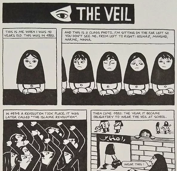 The first textual fragment in the novel is an introduction, the sole textual part of the entire story. It is written by adult Marjane as she explains the grim causes of the Iranian revolution. The visual story itself then begins with a chapter named ‘The Veil’ (Satrapi, 2008). This instantly brings the reader into the narrative of the oppressive world of 1980s Iran, which influences the childhood of the protagonist into instability on the one hand, and rebellion on the other. The opening of this narrative is a return to a moment in history and provides a means of exploring the origins of Marji’s rebellion, frustrations with not fitting into society, and her aim to destabilise authority.