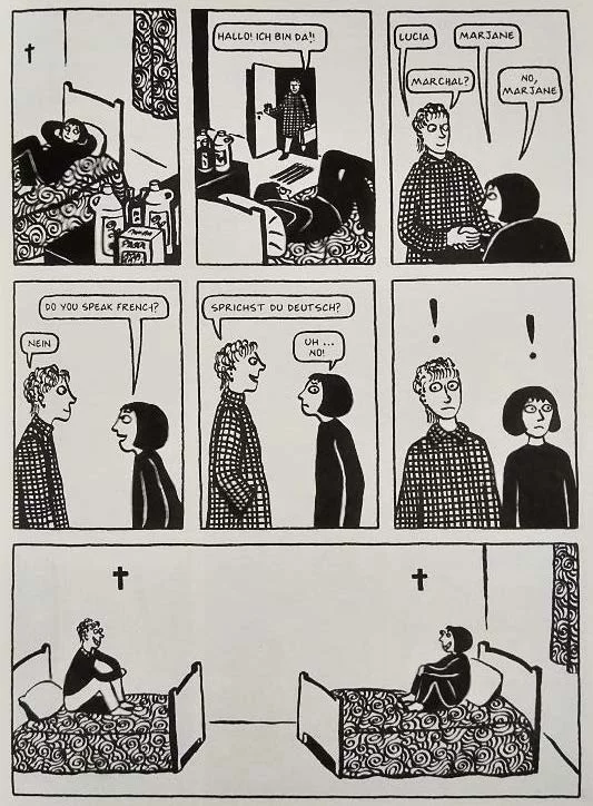 This leads to uncomfortable situations, such as when she meets her roommate Lucia. Her discomfort is shown through their lack of conversation, the space between them and their facial expressions (Satrapi, 2008). Yet, at the moment of writing the novel Marjane is able to explain and translate foreign words and concepts, such as the idea of German supermarket Aldi, indicating that over time she has become able to identify herself with non-native Western languages and culture.