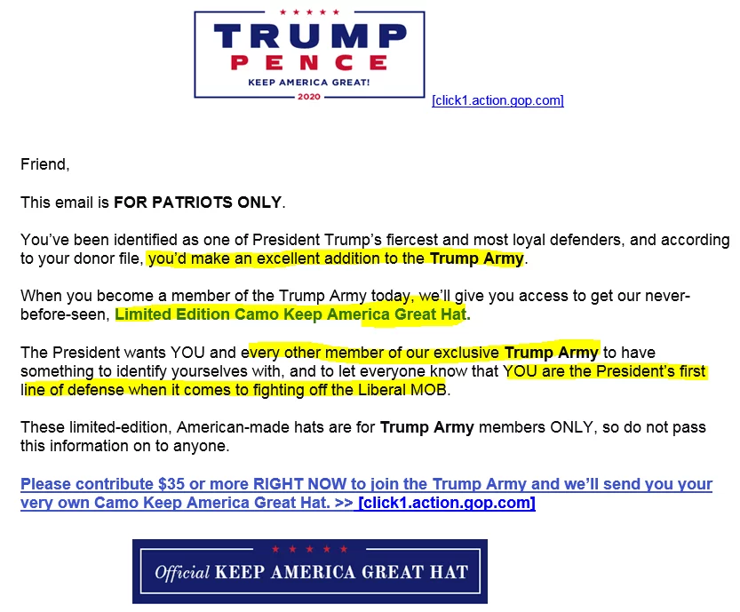 Trump's big organizing more and more starts to resemble the history of ultranationalist squadrons of the 20th century. He is not  building a classic political movement, he enlists people in his personal army to commit to the president’s personal operations. Metaphors matter. The metaphor turns real when those volunteers start to imagine themselves as part of Trump’s personal army. This imagination is explicitly pushed in the letter to his patriots when they are rewarded with a 'never-before-seen limited Camo Keep America Great Hat' that allows 'the exclusive members of Trump's army' to identify themselves with.