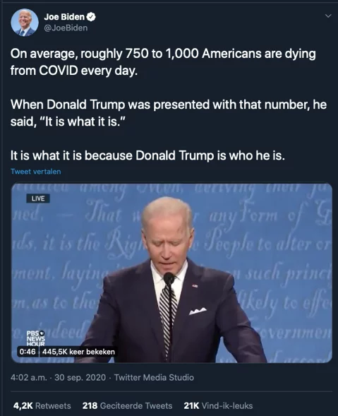 The Biden on Twitter is (a bit) better than the Biden we saw on stage. Biden’s slow talking, losing himself in details and struggling to find his words, is somewhat beefed up online. His discourse is repackaged by his team. But in the end, they have to work with what is there. For instance, his meandering talk on Trump’s disastrous COVID-19 policies is remediatized. The result is not a short pointy clip of one-liners, but a 46-second meandering clip accompanied by one short status that frames Trump as an egoistic self-centered man who doesn’t care for his people. Not much new material is released and most of the Twitter content extracts from the debate.
