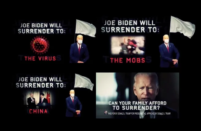 What is most remarkable, is how Biden’s Sleepy Joe image that Trump has created is now presented in a very different context. Biden is presented as a full blown and dangerous enemy of the American people. Sleepy Joe is now framed as an extremely dangerous man because of his weakness. The soft speaking man, the man searching for his words and his nuances, the man caring for the health of the Americans and following the advice of the virologists is now recreated into a man ready to surrender, not willing to fight. Surrendering to Black Lives Matter, Antifa, the radical left, comrades Sanders and AOC, COVID-19, and China.