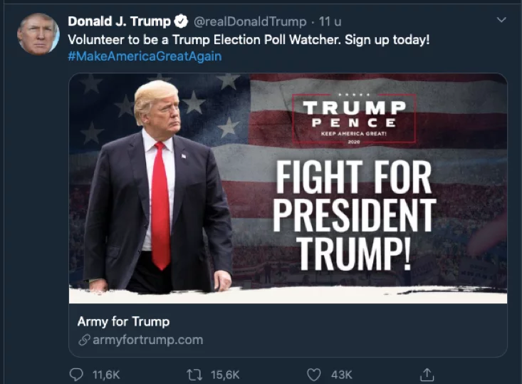 In 2020 we see how the campaign needs to organize its own movement. This can be seen as a direct result of the lack of spontaneous support of this campaign and its financial problems. Trump has no other choice than to structure and organize his movement. To do this, Trump uses the full possibilities of the hybrid media system. During the debate he asked people to enlist to become a poll watcher and his campaign repeated that on his Twitter account. They also use data about donors to his campaign to personally address them and ask them to enlist  in Trump's army (see the letter Washington Post journalist Aaron Blake tweeted). At the same time his campaign needs to create a sense of urgency. This is where the military language and war metaphors come in.