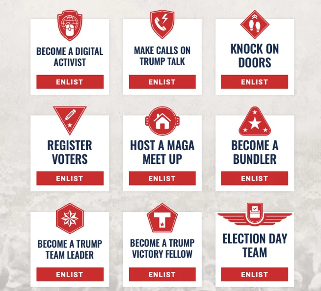 What is most interesting about this site, is the fact that Trump’s grassroots movement is organized under the banner of an ‘army’ that is controlled by Trump’s War Room. The image that accompanies the Twitter post asks those volunteers to ‘fight for president’ Trump. When potential volunteers click on the link, they enter a site that wants them to ‘enlist today. This military language is used metaphorically. People are not asked to actually fight, but to become digital or algorithmic activists, to engage in phone banking, and start knocking on doors and helping people to vote.