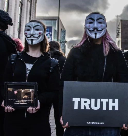 The activists in the Cube of Truth wear the well-known masks from the V for Vendatta movie which the political hacker-group Anonymous is now known for, and with that refer to and make use of the strong message those masks alone obtain. Anonymous for the Voiceless claims that activists get to wear the masks because this is the only way they can stand in the cube for such a long time without people staring into their eyes, but it is not to ignore that there is literally and figuratively more behind those masks than meets the eye.