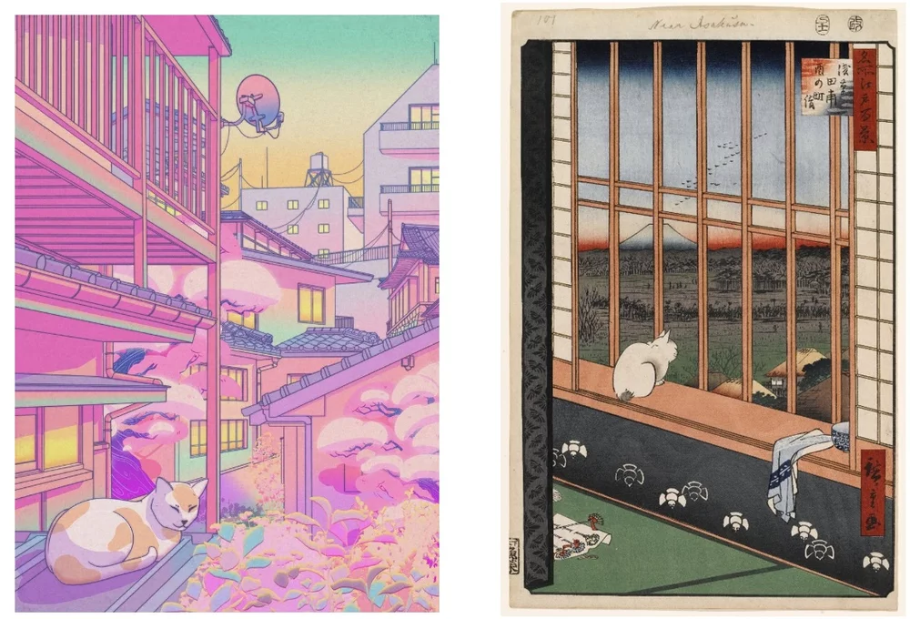 Lastly, the influence of ukiyo-e prints can be drawn even further to the increasingly popular ‘aesthetic lo-fi’ art style, which usually depicts highly stylized manga-esque scenes of everyday activity or city landscapes. Notable are also the stylization of the lines, as well as the heavy use of vivid pastel colours. Elora Pautrat, an environment artist, photographer, and illustrator explains her inspiration for ukiyo-e on her site: ‘Similar to the true meaning behind ukiyo-e: I’m trying to convey through my art, and more especially my illustrations, pictures of a floating, dreamlike world, that brings nostalgia and serenity to people looking at them’ (Pautrat, 2022)