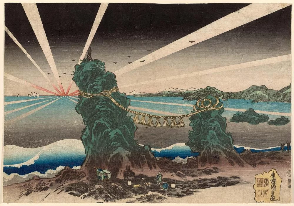 These seemingly peaceful landscape artworks are often accompanied by people doing ordinary things such as field labour or traveling. This illustrates the contrast well with the large scale of nature, and the small simplicity of a human life. An example of this is Hokusai’s ‘The Suspension Bridge Between Hida and Etchu’, where the scenery depicts a beautiful clear sky and a vast rocky mountain landscape, with a suspension bridge above a mountain abyss. While the setting seems serene, the bridge is weighed down by the two passengers and it looks like it is about to snap in two. This creates tension in the image and can create a subliminal feeling.