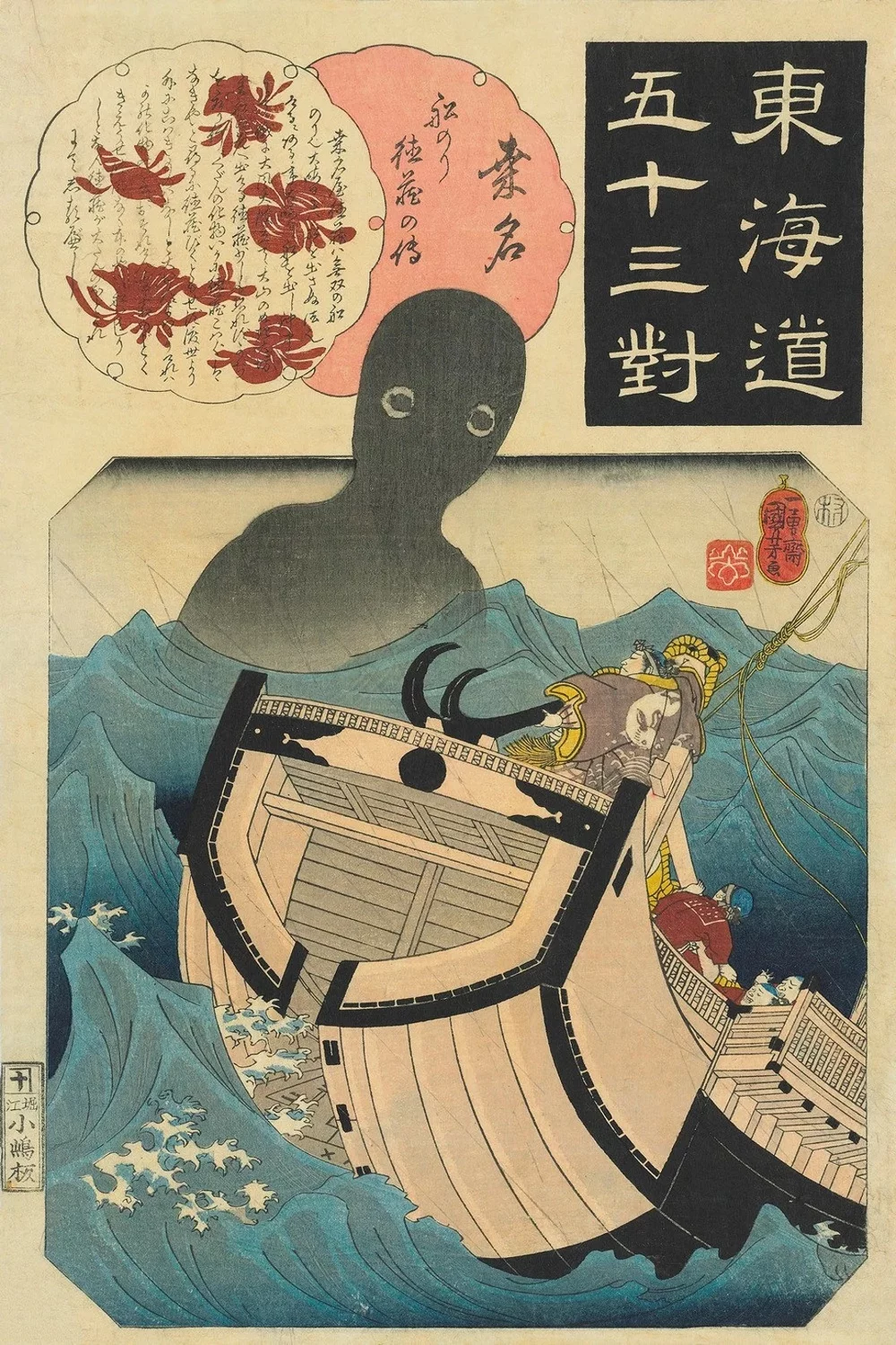 When looking at ukiyo-e art, the ‘terror sublime’ can be related to folklore artwork, depicting ‘Yōkai’ (妖怪, "strange apparition"), Japanese mythological spirits. Utagawa Kuniyoshi (1798–1861) has made illustrations that capture the horror essence of some of these mythological tales, two of which will be highlighted. First, there is the ‘Sea Monk’, a print that represents the story of the ‘Umibōzu’, an ocean-dwelling spirit.