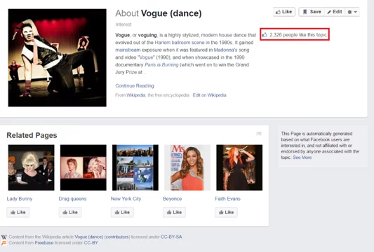 As can be seen in figure 9, over 2000 Facebook users “like” vogue dance, which already suggests that there are voguers active on social media. Not only are there many “likers” on the interest page of the dance style, but also there are groups and pages related to voguing all over Facebook. There are around 80 groups and 100 pages to be found about vogue dance (December, 2016).