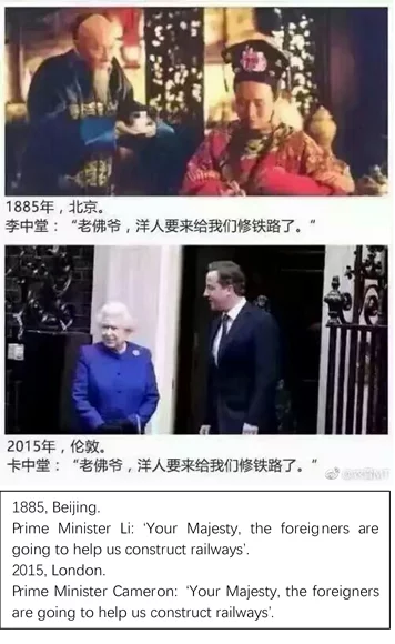 In 2015, a picture about railway construction went viral on Weibo (Figure 2). The picture compares two scenes. One is from the Chinese TV show Towards the Republic, telling the political struggles in the last few years of the declining Qing Empire. The other is a photo of then British Prime Minister David Cameron and Queen Elizabeth II standing in front of 10 Downing Street.