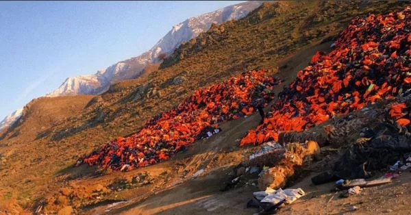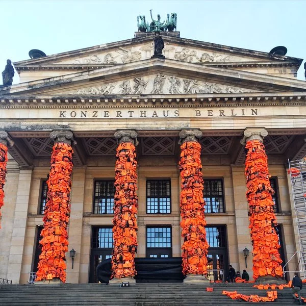 There is a third object that I would like to put forward in order to focus on the artist's engagement. This is a project performed in Berlin. Tens of thousands of orange coloured life vests taken from beaches in Greece, where the refugees arrived from Turkey, are used to wrap them around the pillar of Berlin’s Konzerthaus.