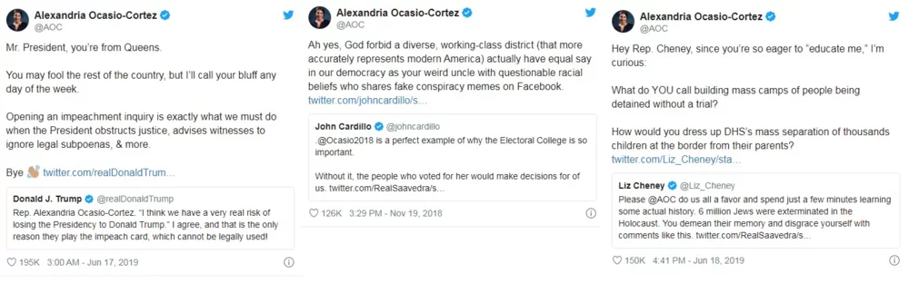 Part of Ocasio Cortez's power is in how she communicates directly with the people through her social media. AOC quickly came off as a social media “expert”, with many of her posts going viral and steering numerous reactions. She became known for responding to negative and positive commentary about her and boldly expressing her opinion about current events without sugar-coating – with a witty sense of humor, too, when needed. As a result, by mid-July 2018, she reportedly had attracted 4.8 million media interactions, according to NewsWhip, while all of the Democrats running for president had reached a combined 6.5 million. Today, she has more than 6 million Twitter followers and continues gaining more and more.