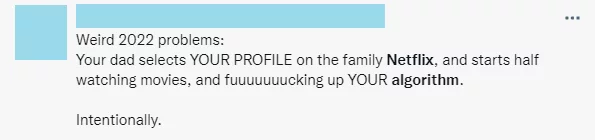 In this category of tweets (n=12) people refer to Netflix algorithmic personalization as an object of value. The authors of the tweets mentioned deliberately “training” their Netflix algorithm to teach it how to recommend content that leaves up to their expectations. Purposeful training of algorithm involves self-discipline as well: sometimes users half-jokingly confess that they are refraining from watching a holiday comedy because it might be bad for their Netflix algorithm. Most of the tweets in the category, however, express anxiety about something or someone “messing with the algorithm” and a desire to protect their personalized environment from intruders. Those tweets are addressed to family members, exes and even to complete strangers who have supposedly hacked into the author’s Netflix account and are using it for free.