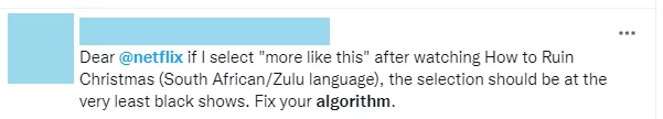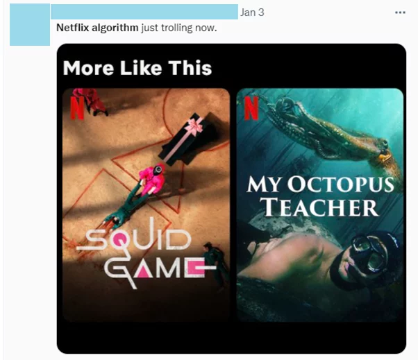 The second group of tweets (n=7) in our study are the posts about odd or funny Netflix recommendations. Such tweets usually consist of a screenshot of the recommendation and an ironic textual commentary. Users express surprise bordering on indignation when they find a totally out-of-place recommendation in their “More Like This” section. Tweets of this kind often personify the Netflix algorithm representing it as some kind of a mischievous being.