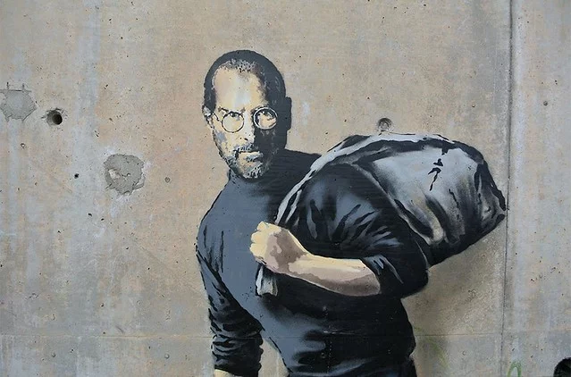 Banksy has created a number of works about the refugee crisis and that advocate for greater empathy in Europe towards those crossing the Mediterranean. In 2016, he reproduced the image of a young girl from Les Misérables on the French embassy in London to draw attention to the use of tear gas in the Calais “Jungle” refugee camp: the girl cries as tear gas surrounds her, while a QR code directs viewers to a video confirming the allegation. Similarly, Banksy painted a portrait of Steve Jobs, the founder of Apple, on a wall in the same camp to address negative perceptions of migrants and refugees: “We’re often led to believe migration is a drain on the country’s resources, but Steve Jobs was the son of a Syrian migrant. Apple is the world’s most profitable company [which] only exists because they allowed in a young man from Homs” (Banksy, 2015).