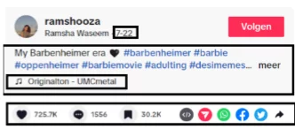 The purpose of hashtags is to "enable users to connect their tweets to large thematically linked bodies of tweets" (Blommaert et al., 2019). Ramsha's use of the hashtag #BarbenHeimer indicates her desire to join in the greater conversation surrounding the Barbenheimer phenomenon. Metadata and stats can provide insight into the post's widespread popularity. These numbers - 725.7K likes, 1556 comments, and over 30K saves - are extremely high, suggesting TikTok's widespread appeal and adoption.