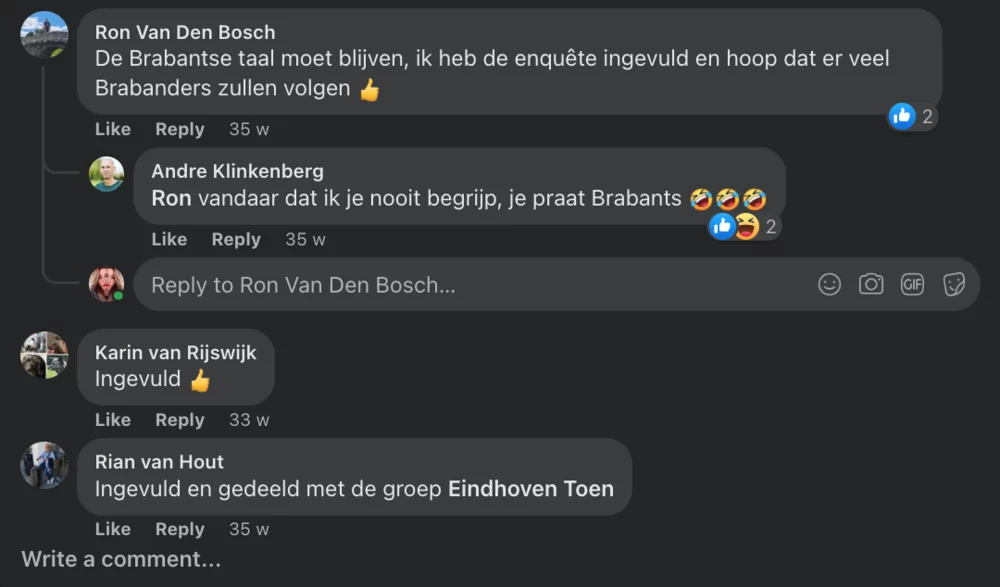 ‘Brabanders en hun taal’ connects a great number of people with shared interests in regional language and culture, offers ample opportunities to contribute and participate, and stimulates citizen science. The main goals of the new policy for regional language in Noord-Brabant have not been reached yet, but a first step has been taken; a growing online community of Brabantians displays its valuation for Brabantish on social media, and in doing so, contributes to the regional language’s preservation and development.