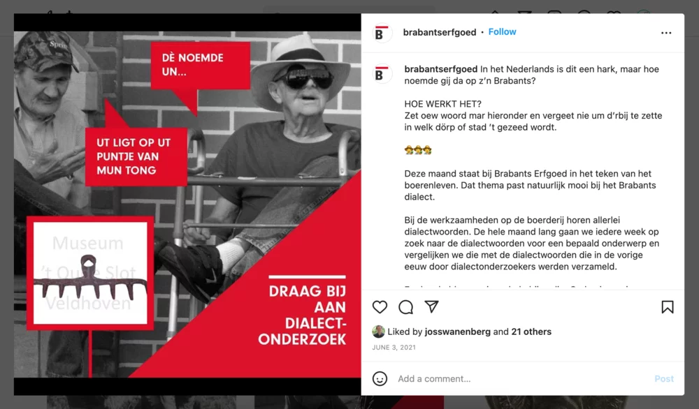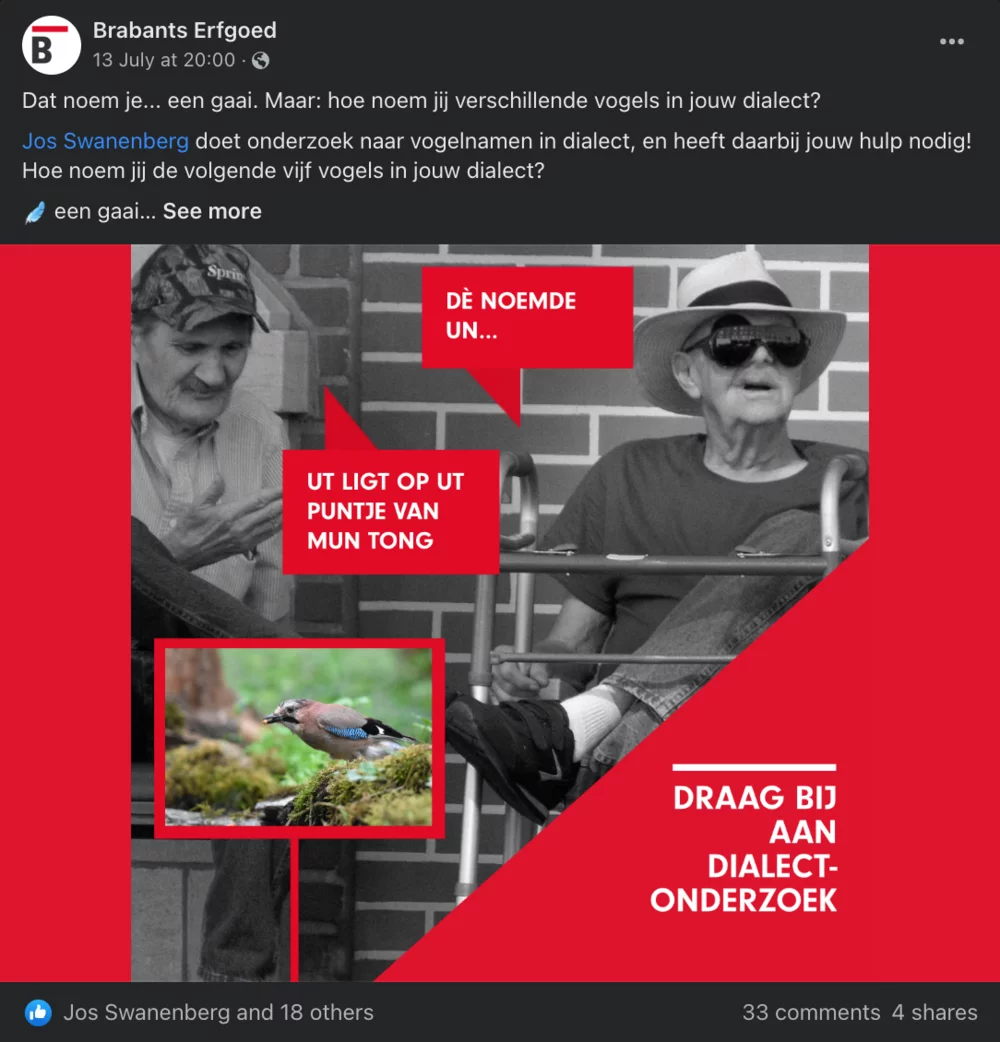 In June 2021 some Erfgoed Brabant-colleagues and I investigated the knowledge of certain agricultural terminology as part of Erfgoed Brabant’s theme-months on Farm life and Dialects, and in July 2022 I tested the knowledge of certain ethnozoological terms, as part of Erfgoed Brabant’s theme-month on Nature, Landscape and Dialects. Using the affordances of Facebook and Instagram, we also involved followers of the social media accounts of Erfgoed Brabant, who share an interest in local history and folklore.