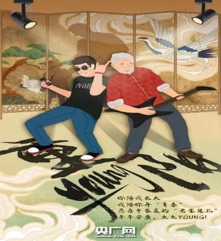 The poster in Figure 1 can be divided into an upper and a lower part. The upper part contains a folding screen in the Chinese style known as Pingfeng, which is typically used to alter the interior decoration of a room. In front of the Pingfeng, the younger person is using a heavy metal rock gesture while sporting sunglasses and AirPods. The older man is playing an electric guitar. Their ‘shadows’ projected in the background reveal a child and a male adult. The Pingfeng is painted with a pine tree growing out of rocks, and a small and a big red-crowned crane surrounded by clouds. These images, representing longevity and auspiciousness in traditional Chinese culture, are frequently associated with the elderly. The lower part of the poster consists mainly of text and cloud-like visual elements. Two simplified Chinese characters and an English lexeme in the biggest font — “重(chong),” “young,” and “阳(yang)” — are placed at the feet of the characters, followed by the much smaller four-line phrases in simplified Chinese characters and an English lexeme: “You accompany me to grow up/ I accompany you to grow “young” again/ May the “old babies” of every family/ Be well every year and stay young forever!” (你陪我长大/我陪你再“青春”/愿每个家庭的“老宝贝儿”/年年安康,久久YOUNG!) The logo of CNR appears at the bottom of the poster. Thus, this poster appears to advocate for respect for the elderly and the ongoing companionship between children and parents who, despite their age differences, share interests such as music.
