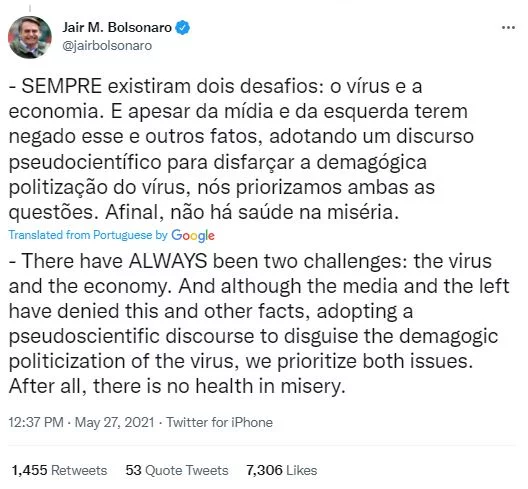 Figure 3 is a post from Bolsonaro’s personal Twitter account which illustrates the circulation of ideology in the context of the ovid-19 pandemic. Bolsonaro claims that there have always been two great challenges: the virus and the economy. While the left and the media, frequently positioned as a homogeneous group of enemies of the government, would promote a “demagogic politicization” of the virus, his government would be a “non-ideological” actor.