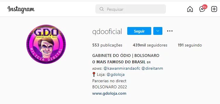 Digital activists and supporters, on the other hand, take part in such a strategy by intense creation of content and reproduction of discourse in social media. Several accounts on Twitter, Instagram, Youtube, TikTok engage in the [re]production and [re]appropriation of Bolsonaro’s message through the creation of digital content aligned with platforms’ algorithmic distribution of content - that is, contents shaped in order to stay relevant, to be distributed and to generate interaction. xamples goes from the nearly 440 thousand follower Instagram profile @gdooficial, in Figure 4, that names itself as "Gabinete do Ódio" (The hate cabinet) and produces content dedicated to meme-culture, digital trolling and negationism.