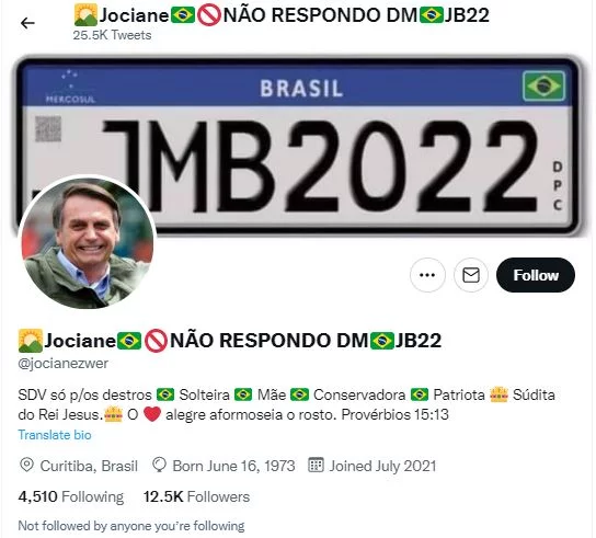 Personalist figures also mobilize in social media: Figure 5 shows a woman who identifies as mother, conservative and patriot, whose profile picture brings the image of the president himself, while account name and cover picture state “JB22” and "JMB2022" - allusions to Jair Bolsonaro’s reelection in 2022. This user joined Twitter in July 2021 and has already reached milestones of more than 25 thousand tweets and more than 12 thousand followers, showing an intense - and politicized - digital activity.