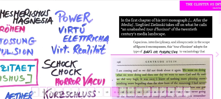 The individual contributions make associative arguments. Heather Love’s article “The Cluster as Interpretive Gesture”, for example, contains hyperlinks in ‘handwritten’ typography. Clicking on the image “HOVER”, handwritten in black marker, for example, reveals a text fragment from Ezra Pound’s The ABC of Reading about exhibits, stating that “the ideal way to present the next section of this booklet would be to give the quotations WITHOUT any comment whatever [sic]”, only to immediately lament the impossibility of this option as “in the imperfect state of the world, one MUST tell the reader”. An interesting choice, considering that the whole issue consists of comments on quotations from Zielinski’s work. Love does not explain the Pound quotation in her article, yet this text fragment reflects the varying levels of comments on medial mode of the issue. The texts explain some uses of hypertext and multimedia, while others remain open. The introduction, for example, refers to the issue as topography and lines, but does not explicitly refer to the maps on the background and illustrations of single routes, except to attribute them to their source. This is, in Pound’s words, “a plan […] the readers would see”. Reading this type of multimodal publication raises different expectations from the academic text than conventional articles do, encouraging more associative connections for both the author’s production and the readers interpretation.