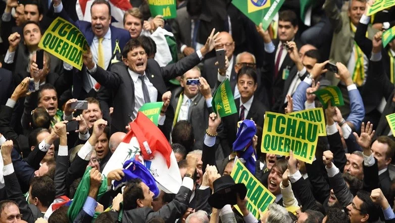 Members of the National Congress celebrating the victory of Dilma's Impeachment process, April 2016. On the signs, “Goodbye Dear!”