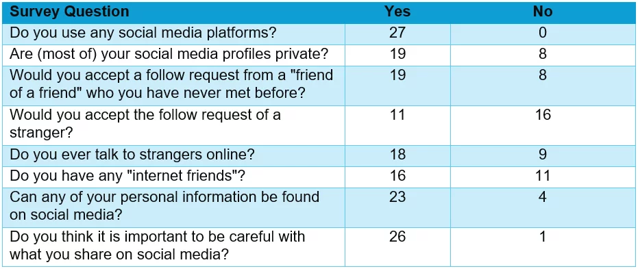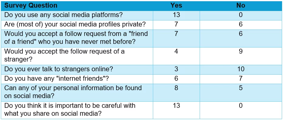 Everyone answered “yes” to the question about social media use, showing that all individuals use some form of social media. Surprisingly, the youths from affluent neighbourhoods have more private profiles on social media than the youths from favelas. However, the other questions show that individuals from affluent neighbourhoods are less reserved and more trusting of strangers on social media. This can be seen by the large amount of “yes” responses to the questions about follow requests of strangers and having “internet friends”, for example. Finally, one person from an affluent neighbourhood stated that it is not important to be careful with what you share on social media.