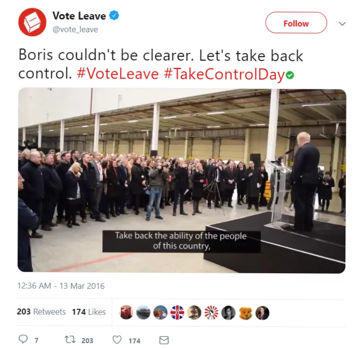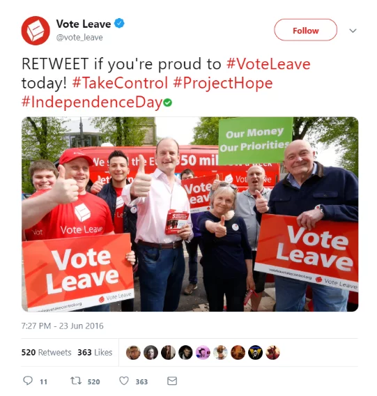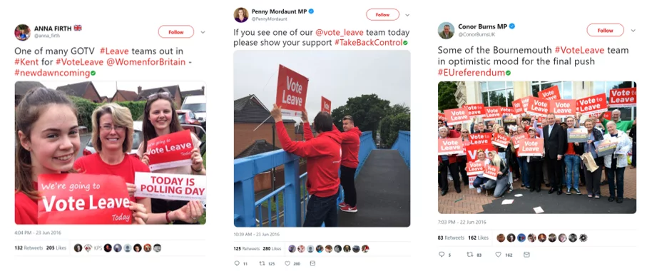 In the lead up to and on referendum day, it encouraged persons to assist the Leave campaign whatever way they could in a physical ‘offline’ sense, by re-tweeting the actions of similar persons on the official account @vote_leave to encourage similar behaviour from supporters.