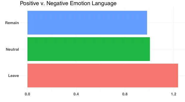 This can be evidenced by comparing the language of Leave users versus Remain users. Research through the Linguistic Inquiry and Word Count has found that Leave tweets were generally: