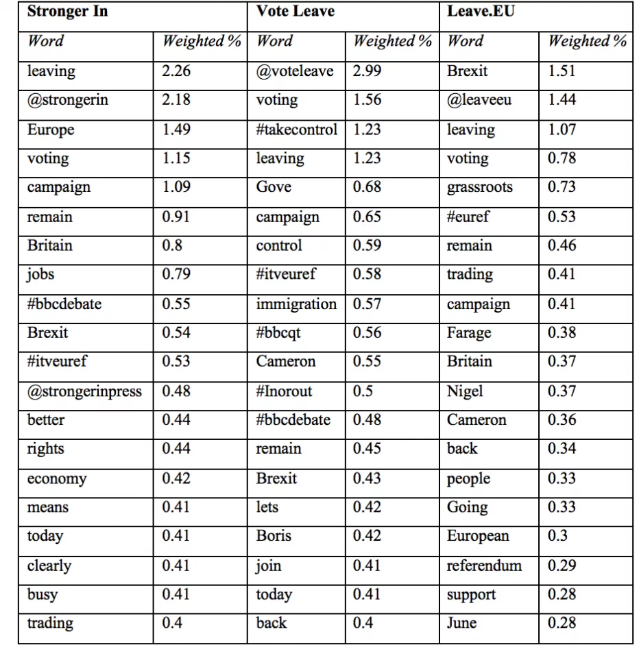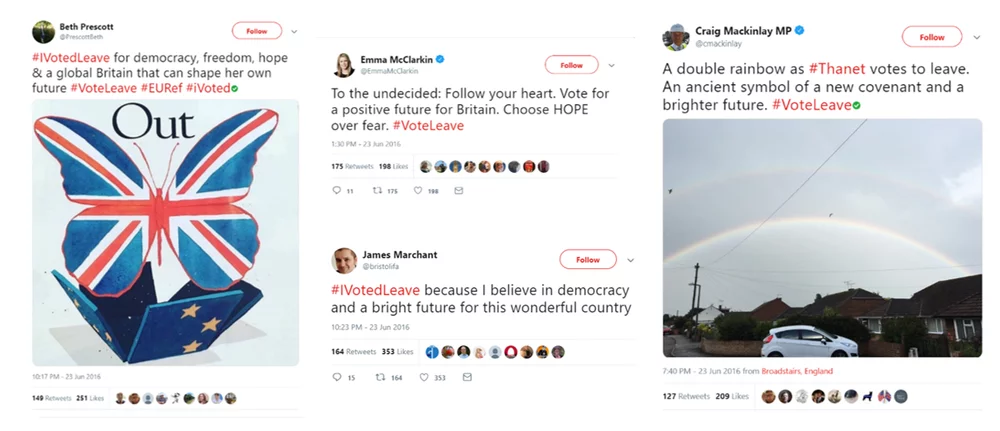 The intuitive and overwhelmingly optimistic message purported by Leave on Twitter was also vital to its success, contrasting sharply with the negativity and spitefulness projected in other aspects of the Brexit referendum. By appealing to the emotional rather than rational foundations of the debate on Twitter, voters were largely responsive to this positivity and future-orientated approach. Whilst the relentless tide of negative economic forecasts and sea of complicated and calculated arguments promulgated by Remain may have been effective in an academic debate, when it came to Twitter, Leave were dominant in its simplistic future oriented positivity (Polonski, 2016).