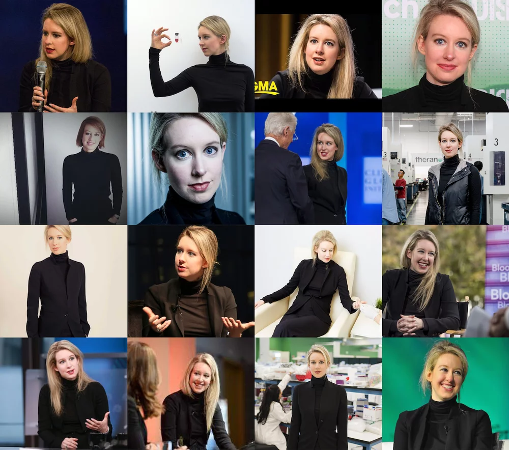 Research shows men are more likely to invest in men, rather than in women (Bernasek, 2010). Holmes, a woman in a male-dominated field, needed these male investors and adjusted her female persona into something more fitting using intertextuality. Holmes began to copy Steve Job’s distinguished fashion style wearing solely black turtlenecks (see Figure 1), as she was an admirer of the Apple founder and important figure within Silicon Valley (BusinessInsider, 2018). Holmes made sure to use the same marketing manager and creative director who had also worked for the iPhone releases and who was also the brain behind the iconic Think Different slogan, making her advertisements appear similar to Steve Job’s (BusinessInsider, 2018). Her consistent aesthetic way of dressing strikes as a uniform: a non-verbal way of projecting power and strength. It harnesses the psychological impact of body shape, colour, and ornament to create an impression of dominance, authority, and power (Carlos, 2021).