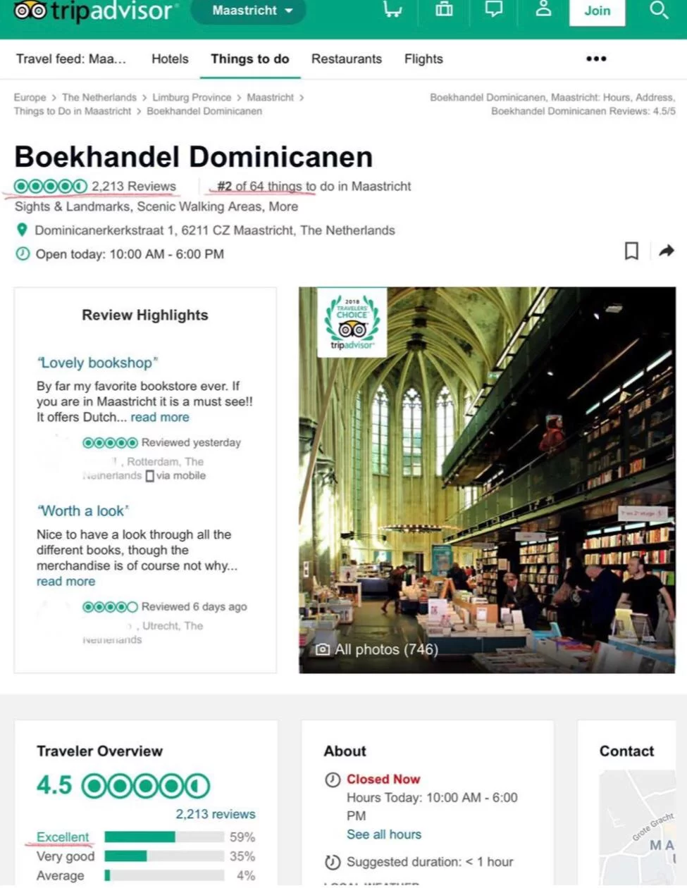 In Maastricht, the Boekhandel Dominicanen (Figures 5 and 6) is a famous landmark which scores second place of must-visit locations on TripAdvisor (Figure 7). The old church was turned into a bookshop and attracts thousands of visitors every year. The inner design was slightly modified, however, the elements typical for the Catholic church, such as the cross, have kept their central place in the design. As we can see in the picture below, the table for reading in a form of a cross stands in the middle of the church’s place.