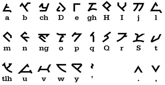 Another constructed artlanguage that will be discussed is Klingon. Klingon is developed by Marc Okrand for the TV shows and films of Star Trek. Unlike Quenya, Klingon was created in oral form first. Because it initially only appeared briefly, the actors were simply told to make incoherent grunts and sounds when “speaking Klingon”. When the production of the third movie started the Klingon language was to be featured more prominently. Okrand created a dictionary and grammar based on a few official words that had been created throughout the years and has said that he deliberately designed it to sound “alien”, using rare phonemes as well as typologically uncommon features. (Okrand, 1992). In figure 1 you can see the typography of the Klingon language.