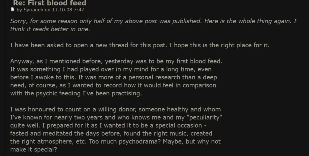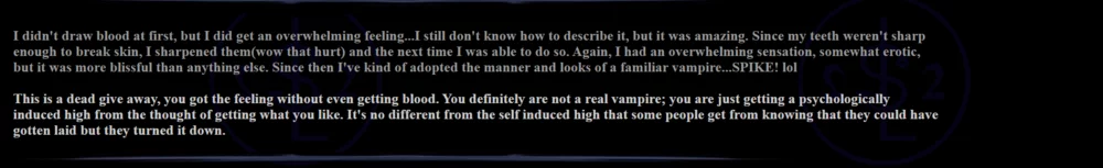 Real vampires do not satisfy their desire in the way that probably many of us imagine judging from what movies and literature have taught us. As we can see in Figure 1 above, they consume blood only from donors, who are people they know and trust with their identity. Also, the donors give their blood with consent (“willing donor”). But how do real vampires describe the taste and the feeling of consuming blood once they get to do it?