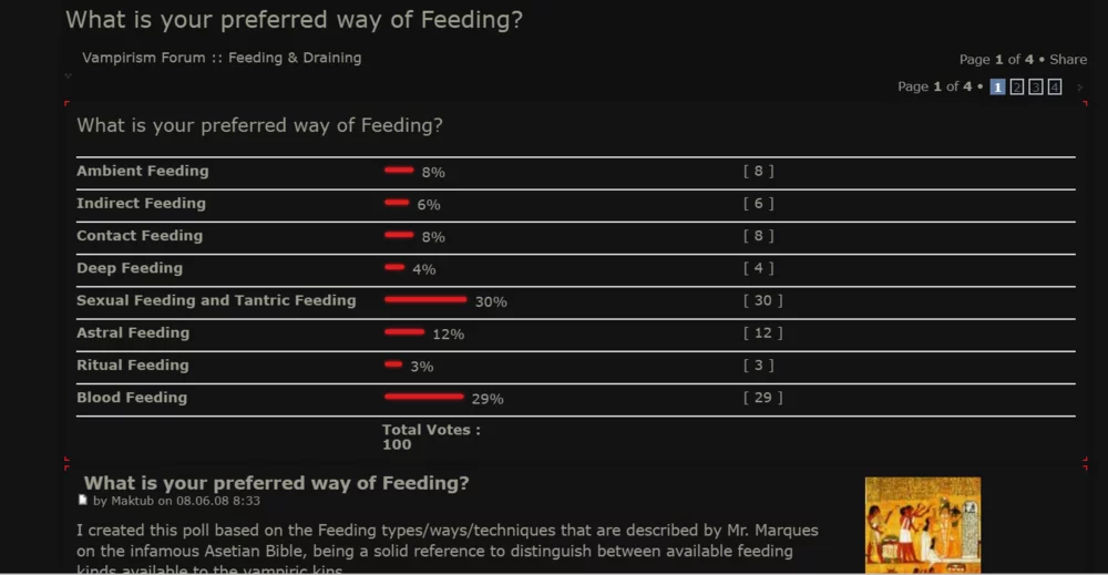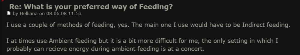 Interestingly, however, some of the members of the forum tend to believe that there are no absolutely divided types of feeding. As forum member Maktub states, “psychic vampires can draw energy from blood, the same as sanguinarians can draw energy alone without the blood”.