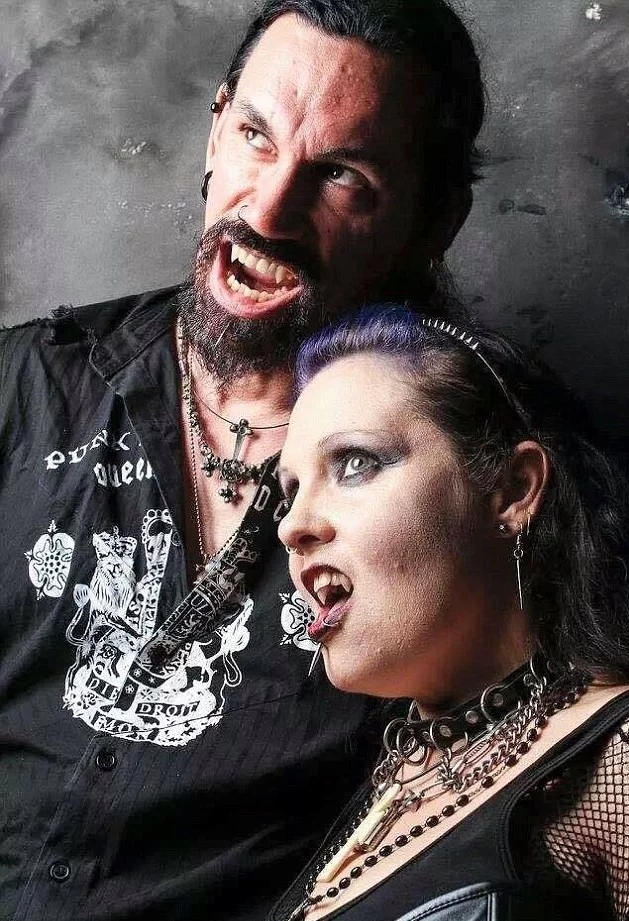 In Figure 4, we can see Pyretta Blaze and Andy Filth, a married vampire couple, who are active and fully engaged members of the vampire community. As we can observe, they are dressed in dark clothes and wear black makeup, which are typical features for the gothic style. Aside from the blood-drinking and energy feeding, a significant number of the members of the real vampire community dress in gothic style, which suits their self description as "dark creatures of the night".