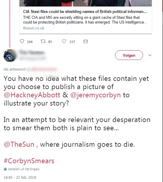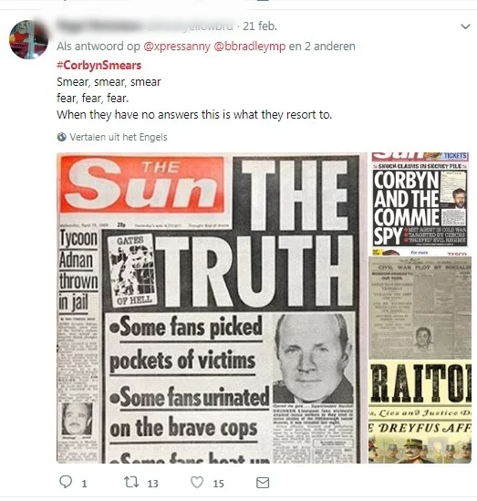 The allegations, however, were quickly debunked. Corbyn himself swiftly dismissed them as "a ridiculous smear" and ridiculed the tablois for "going a bit James Bond," probably as a sign of fear for the Labour leader whose popularity is on the rise. The real James Bonds - British intelligence officers - backed him up. There was no evidence of Corbyn performing espionage duties for the Czech secret services. On social media, hashtag activism started at once using #CorbynSmears as the thematic label for three large types of actions: direct discussion (as in Figure 1), boomerang statements pointing towards other fake news stories by these tabloids (as in Figure 2), and more broadly focused political essays on the role of media in society (as in Figure 3). A highly effective campaign was waged on social media this way, marginalizing the voices supporting the tabloids and their stories.