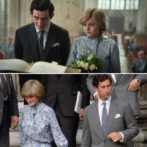 In Figure 2 above we can see the re-enacted wedding rehearsal scene in ‘The Crown’. Although what the actors were wearing seem closely similar to what Prince Charles and Princess Diana were actually wearing, we can clearly see the differences between the design and colour of outfits. It is useful for actors to use outfits as similar as possible to the actual outfits to help viewers of the television series recognise the event being referred to and feel some sort of familiarity with both the event and characters.