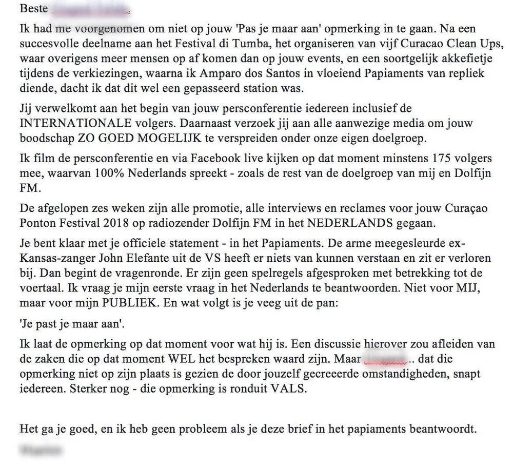 In the statement written by the journalist, he expressed how he has participated in several cultural events in Curaçao by speaking and even singing in Papiamentu. He also stated that he is filming the press conference for at least 175 people who are all Dutch speakers, just like the rest of his target group. He continued expressing his disappointment with the way the organizer reacted to his question, because it caused a language issue which had nothing to do with the real issue of the press conference. He ended his statement by saying how he has no problem with receiving an answer in Papiamentu, or addressing anything in Papiamentu.