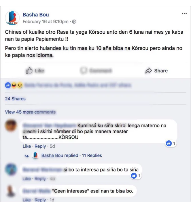 Translation of the comments: "Start by learning how to write the mother tongue properly and write the name of your country how it should be written... Kòrsou"; "If you are interested to learn you will learn it"; "No interest" that is what they will say.